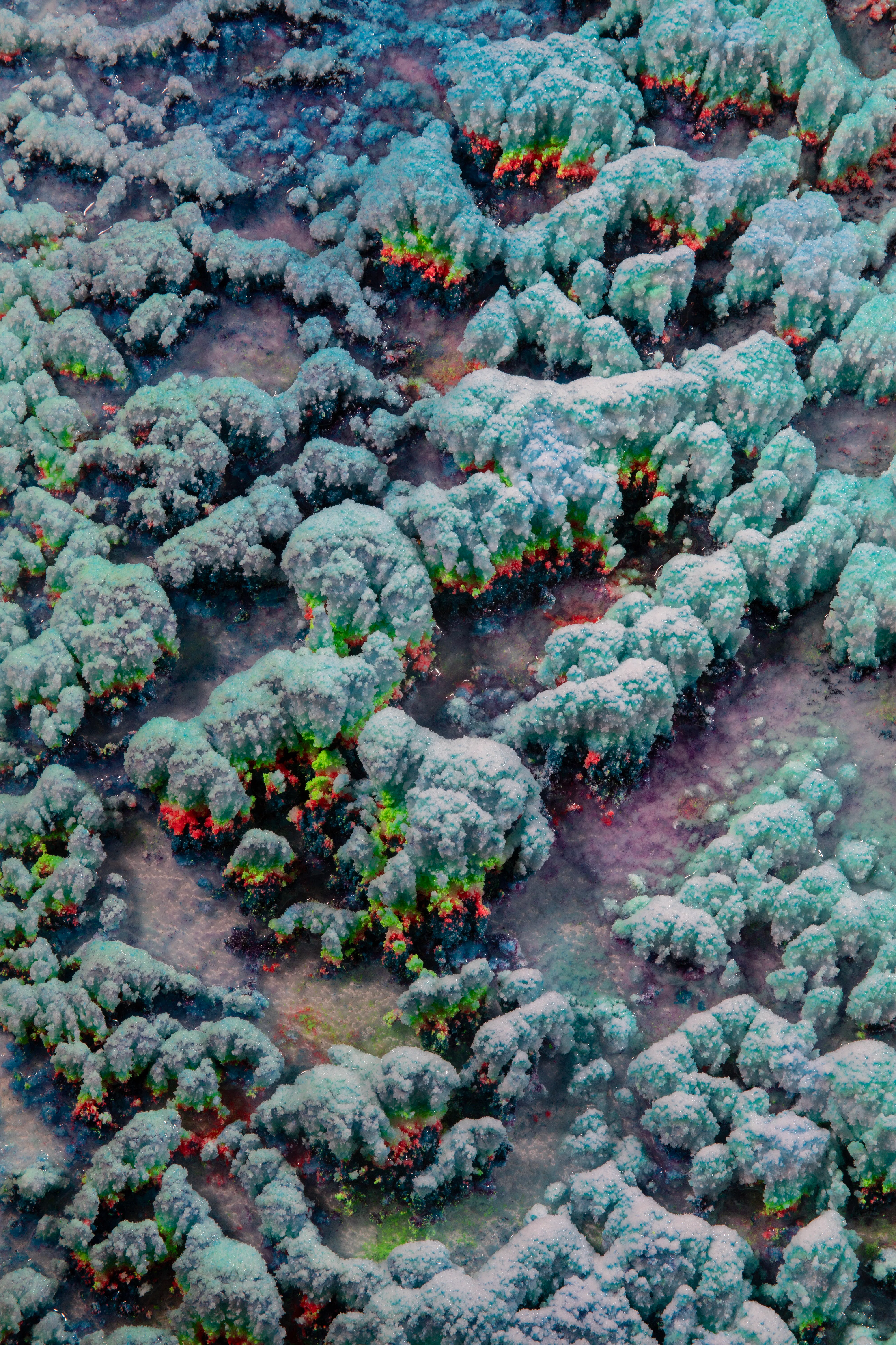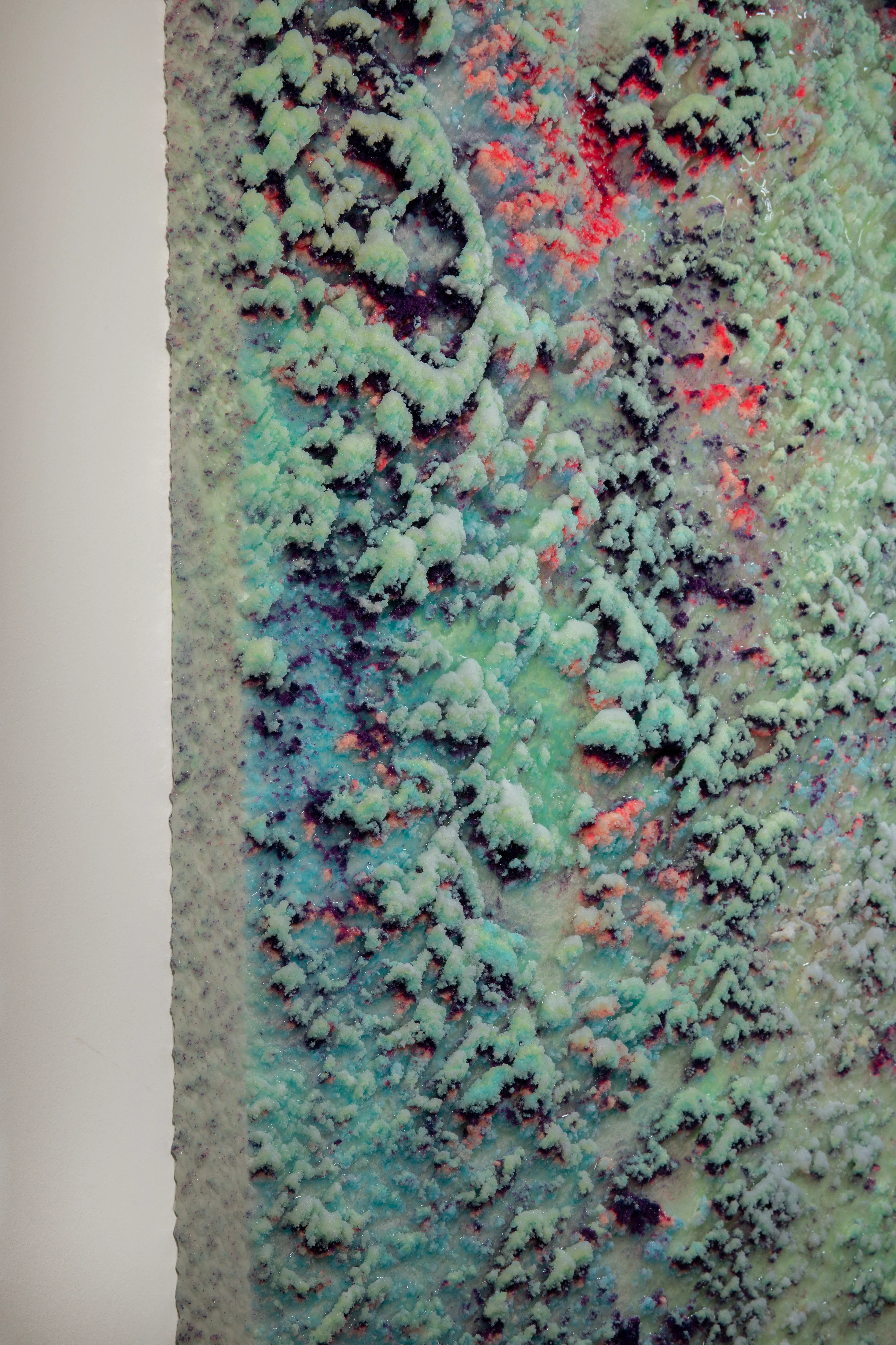 Colorado-based artist Dylan Gebbia-Richards brings a unique perspective to his transcendent works, where the organic is seamlessly appropriated by the artificial. Drawing inspiration from fractals, or the "expanding symmetry" observed in nature's patterns – from river deltas to the microscopic arrangement of veins within our bodies – Dylan creates monumental organic wax sculptures that pay homage to these captivating patterns. His technicolor palette invites viewers into a synthetic environment that simultaneously delights, disorients, and immerses them in a sensory experience. Dylan envisions his studio as an organic microclimate, where he orchestrates but ultimately relinquishes control over the reactions that produce the intricate patterns in his artworks.